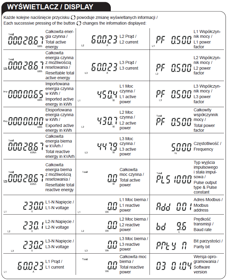 - pomiar napięcia, prądu, mocy czynnej i biernej z podziałem na fazy