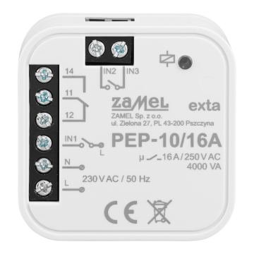 Moduł przekaźnika dopuszkowego PEP-10/16A służy do włączania/wyłączania urządzeń elektrycznych za pośrednictwem wejść bezpotencjałowych (COM/NO) oraz potencjałowych (SL).