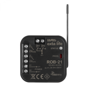 ROB-21 to odbiornik dedykowany do otwierania i zamykania bram wjazdowych lub garażowych z poziomu pilotów lub aplikacji Exta Life. Współpracuje on z centralami bramowymi wykorzystując wejście lokalne. Urządzenie można stosować także do sterowania elektrozaczepem w furtce. Odbiornik posiada dwa wyjścia NO przekaźnikowe oraz dwa wejścia pod czujniki krańcowe. Zasilany jest napięciem 12-24 V AC/DC.