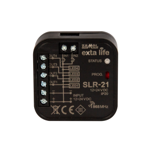 SLR-21 służy do sterowania jednobarwnymi taśmami LED zasilanymi napięciem 12-24 VDC. Pozwala na niezależne sterowanie maksymalnie czterema obwodami, taśmami. Realizuje funkcje włącz / wyłącz oraz płynną regulacja jasności w każdym kanale. Sterowanie jest możliwe z dowolnego nadajnika Exta Life, aplikacji (wymaga kontrolera EFC-01) oraz przewodowo z przycisków lub włączników. Sterownik posiada konfigurowalne czasy włączenia, wyłączenia oraz rozjaśniania / ściemniania. Zasilanie 12-24 VDC. Obudowa do montażu w puszkach fi60.